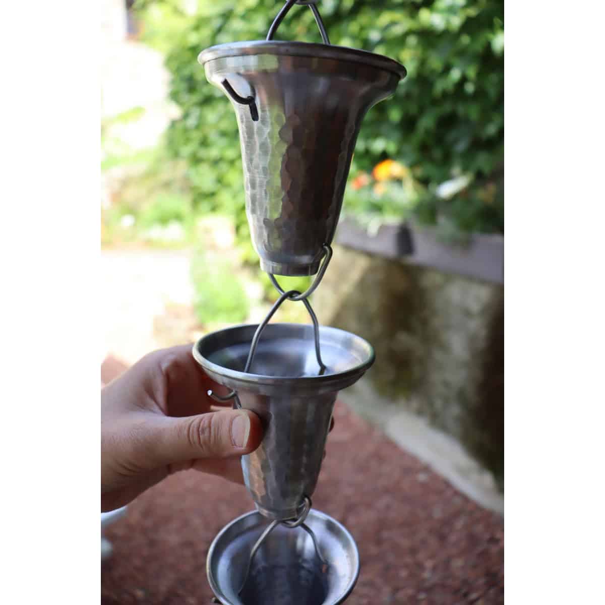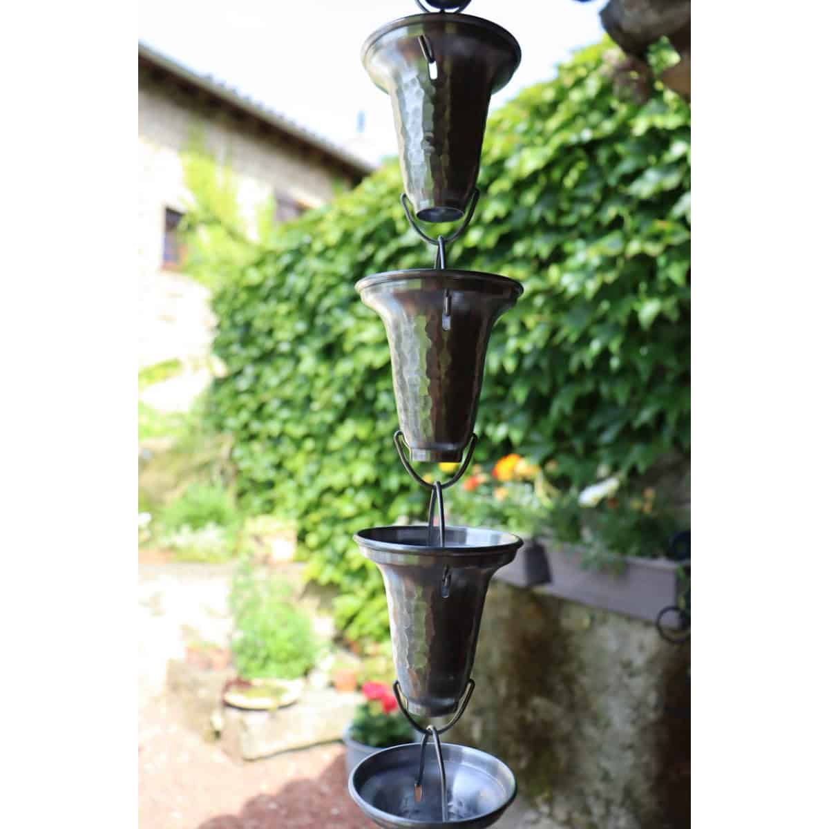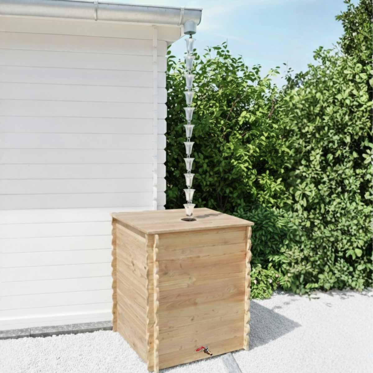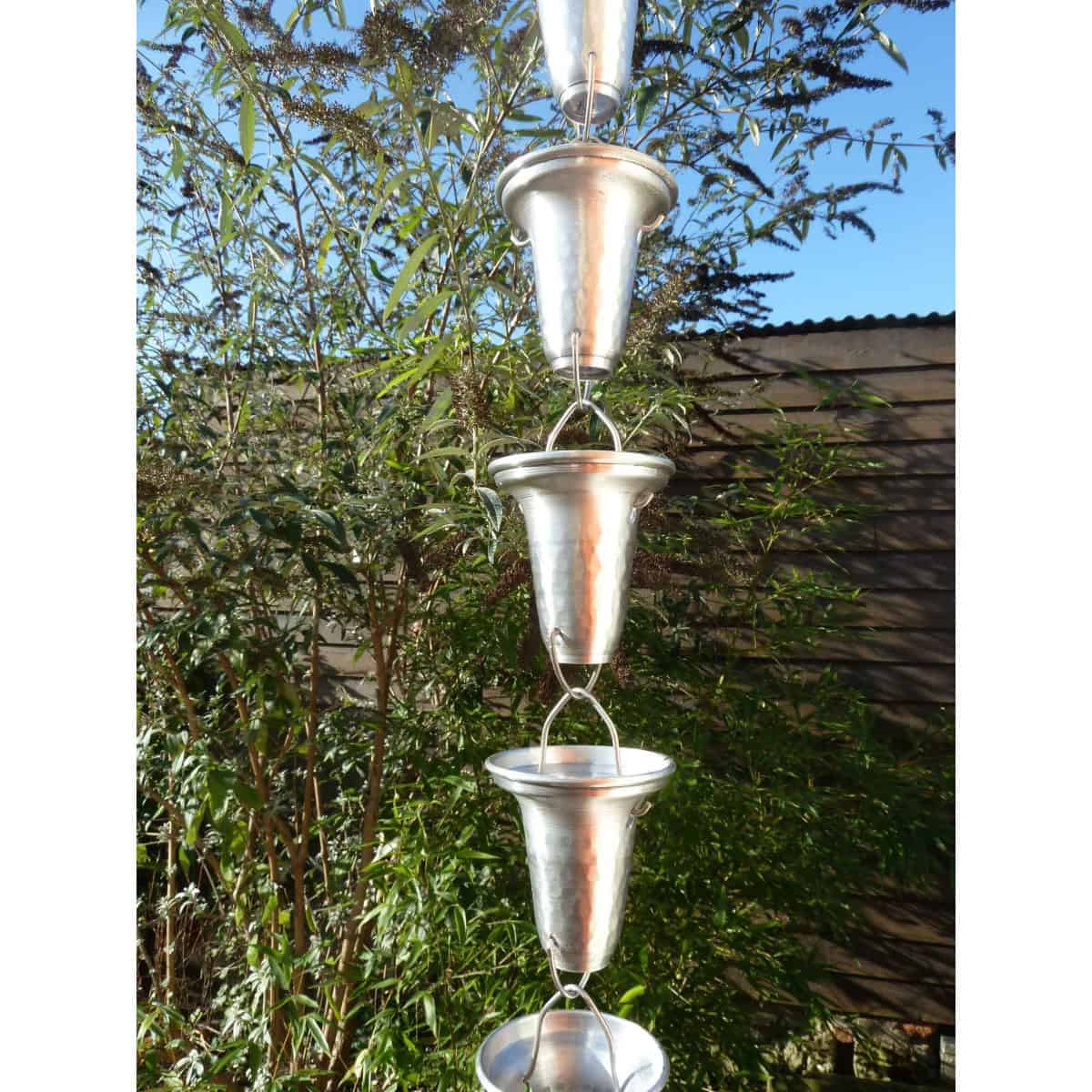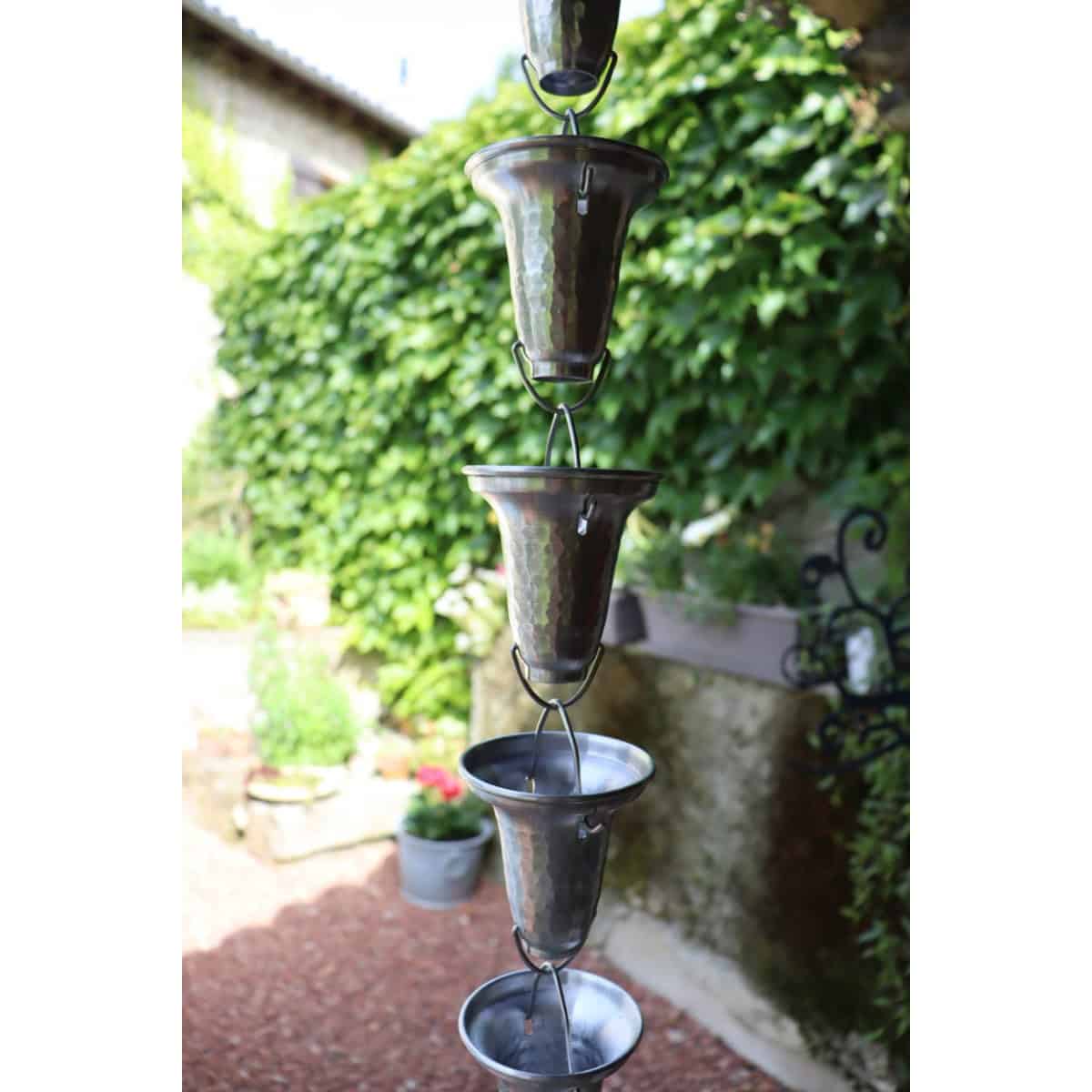 Issue de l’architecture traditionnelle japonaise, la chaine de pluie en aluminium haut de gamme remplace une descente de gouttière classique. Elle se compose d’une succession de coupelles ou de maillons qui guident l’eau de pluie depuis le toit jusqu’à une réserve d'eau de pluie en bois par exemple. À chaque averse, l’eau s’écoule délicatement d’un niveau à l’autre, créant une musique naturelle relaxante. Contrairement à une gouttière rigide, cette chaine de pluie laisse l’eau visible, ce qui contribue à la valorisation du jardin ou de la terrasse, tout en maintenant une évacuation efficace, même lors de fortes pluies.
