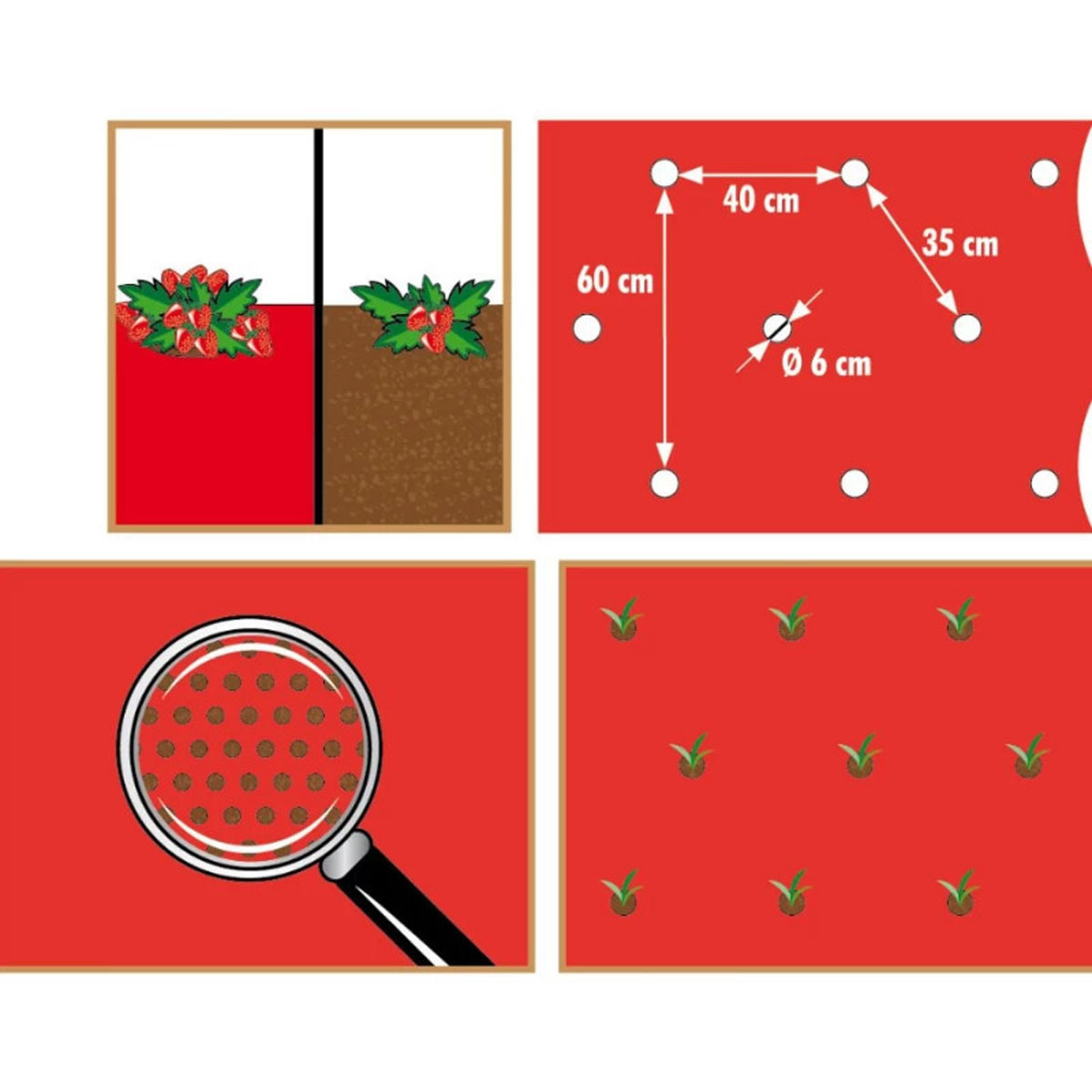 Avec ses 40 trous prédécoupés de 6 cm de diamètre espacés tous les 35 cm, ce film de paillage vous facilitera votre plan de potager. Plus besoin de calculer les distances entre les plants de tomates et les rangs, il vous suffit de planter. Nous vous conseillons d'utiliser le film de paillage pour planter 40 pieds de fraises ou 20 pieds de tomates au maximum.