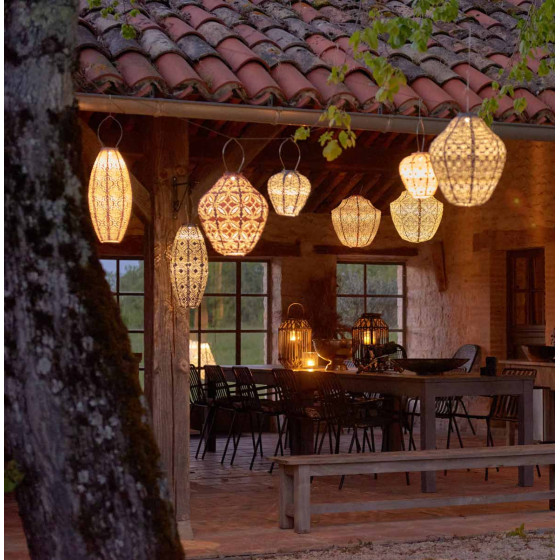 Créez une ambiance féérique en composant un assortiment de lanternes solaires suspendues, disponibles dans une variété de formes et de couleurs pour un effet lumineux unique et personnalisé dans votre jardin !